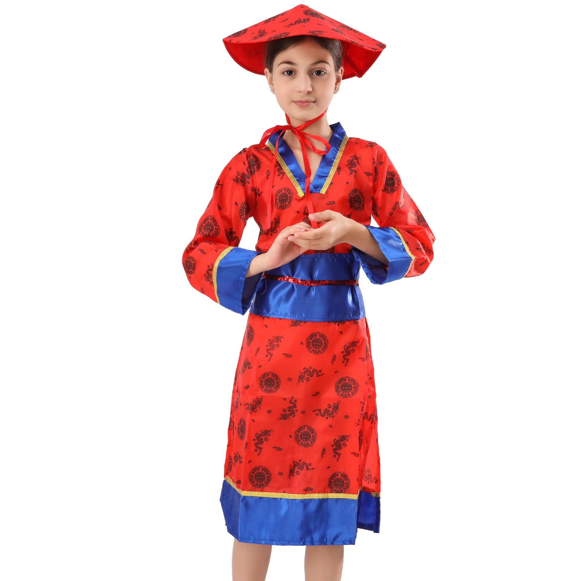 少女日本式忍者コスプレ衣装赤青ロングスカート帽子ベルト三点セット舞踏会舞台服