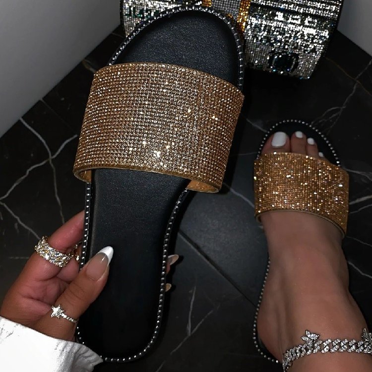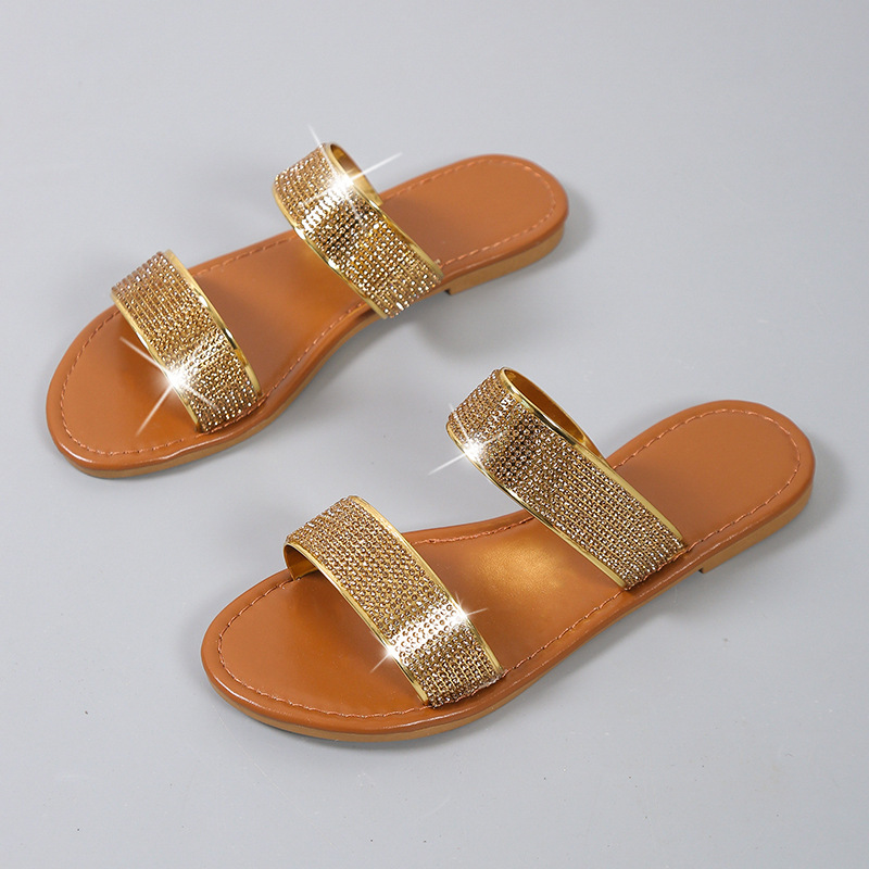 日韓対外貿易の平底のドリルのスリッパの女性の1字は金属の質感の砂浜のサンダルのslipperの独立している駅を持ちます。