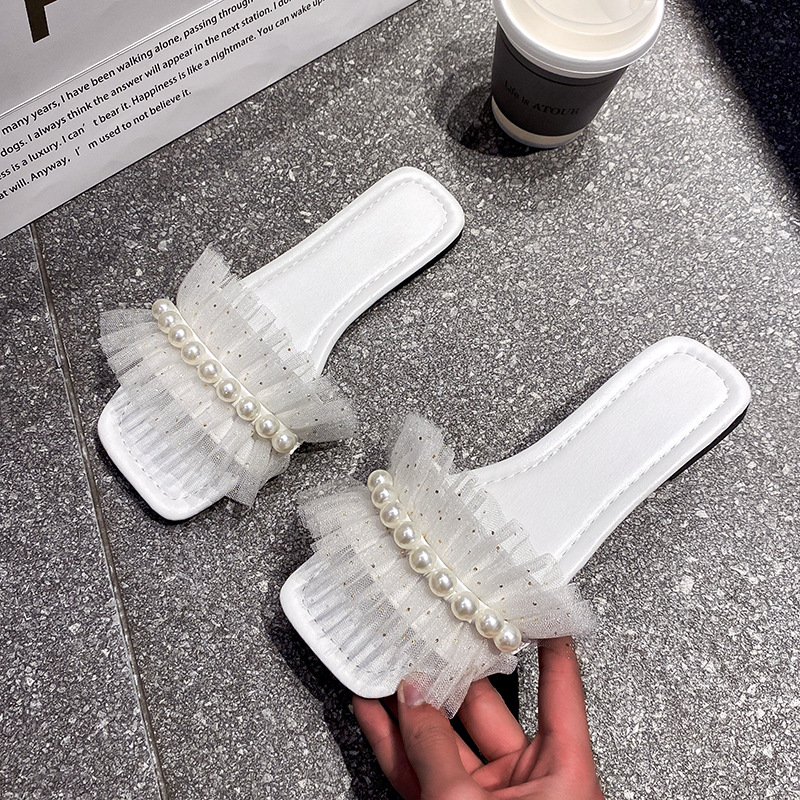 日韓の対外貿易の外は平底の1字のスリッパの女性の真珠のレースの角の頭の砂浜の冷たいスリッパのslipperを着ます。