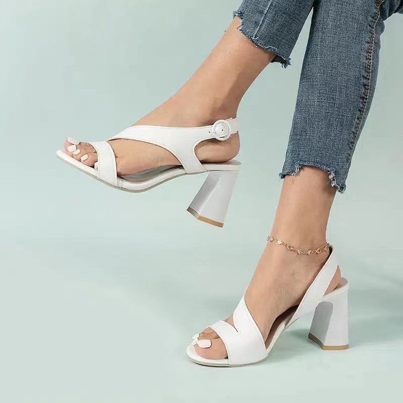 欧米の対外貿易の大きいサイズのハイヒールの露指のサンダルの女性の越境する新型の太いヒールは透かし彫りのファッションの靴のwishの商品の供給源を掛けます。