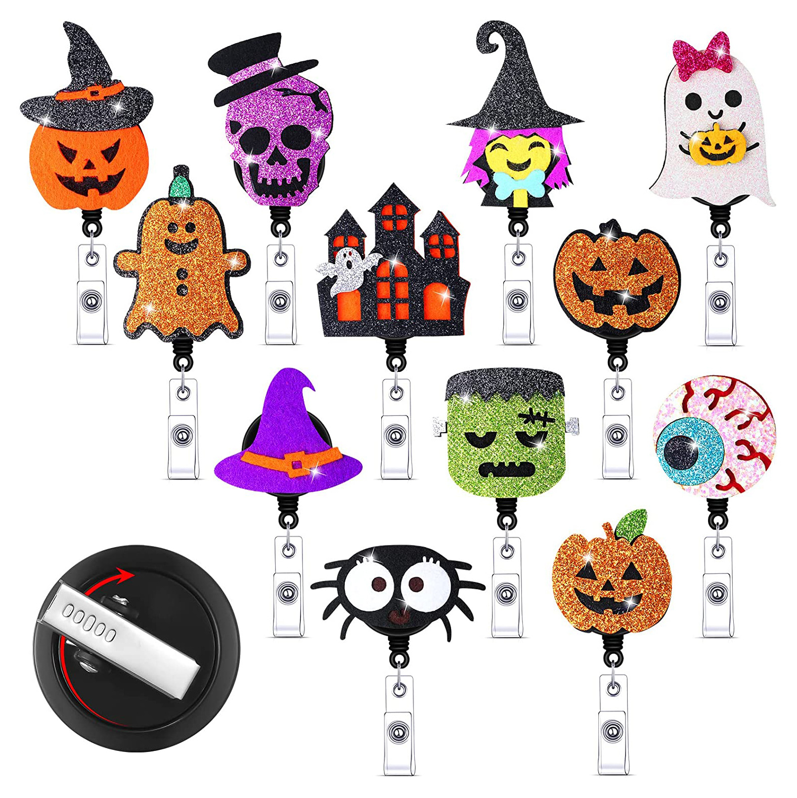 12点セットハロウィン金ネギキラキラ刺繍フェルト伸縮式回転プルアップ缶バッジリール