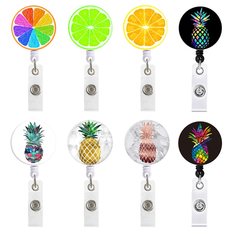 国境を越えた現物の果物が輝いている大理石パイナップルが伸縮しやすいレモンを引きやすい看護師のリールバッジクリップ