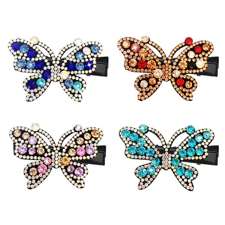 アマゾンの現物のドリル蝶革のヘアピンの立体的なアヒルのクリップにドリルを入れて蝶結びを挟んでいます。