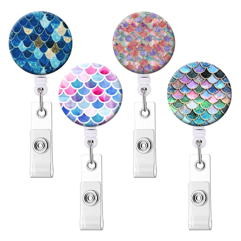 カラーのマーメイドのうろこの回転のワニのクリップの引きやすいボタンの看護師の引きやすい伸縮する証明書のボタンのバッジの図案
