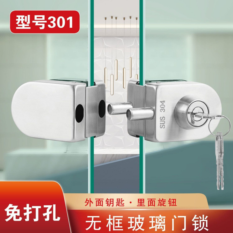 ガラスドアロック両開きドア単開きドア穴なしショップガラスロックフロアロック引き戸両開きドアロックラッチフレームレスロック