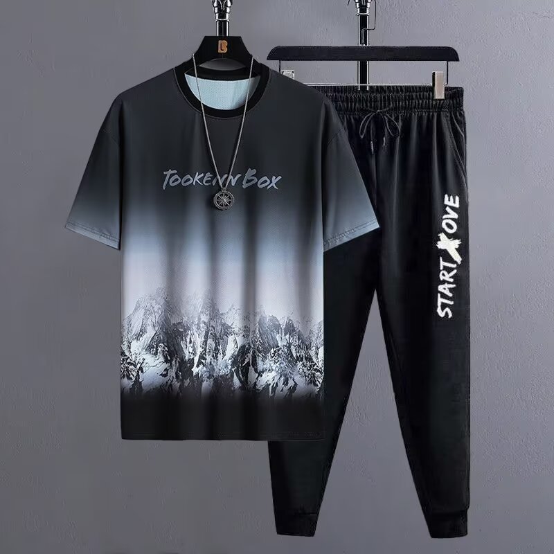 源メーカー雪山プリント夏新作スポーツグラデーションスーツ男性ランニング半袖半ズボン2点セット