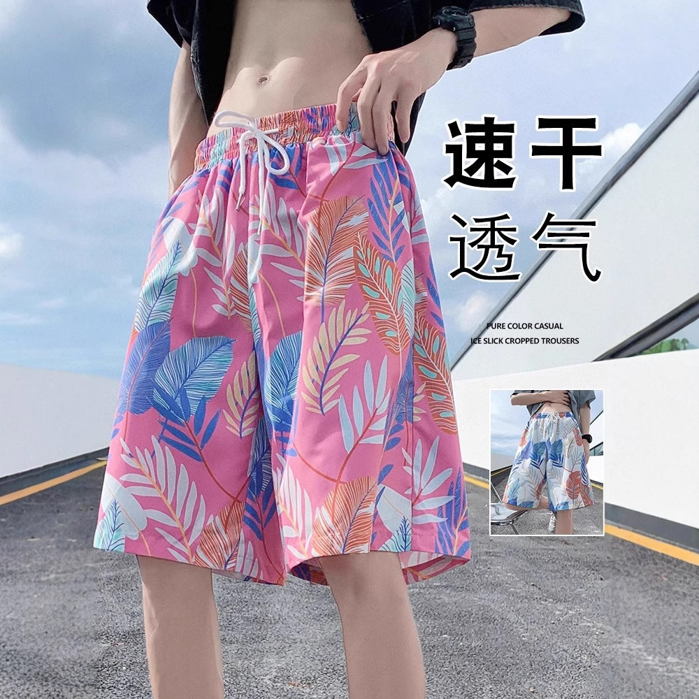 ビーチパンツ男夏の薄い氷の花の半ズボンのゆったりとしたストレートのファッションカジュアルな家の5分の速乾性の大きいパンツ