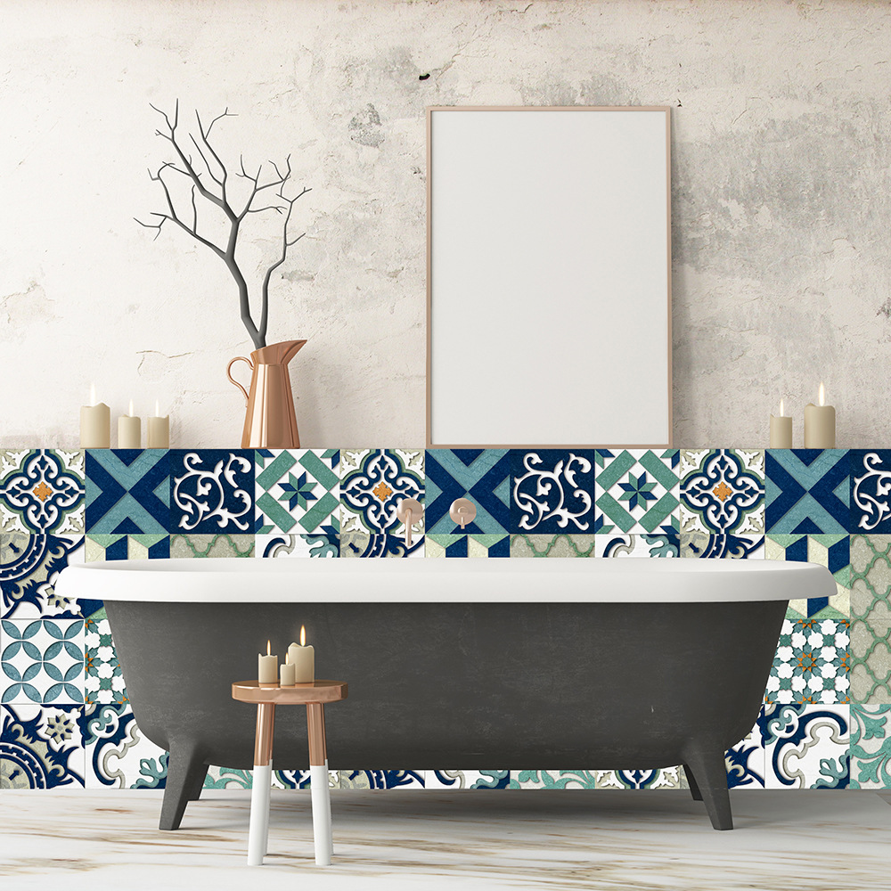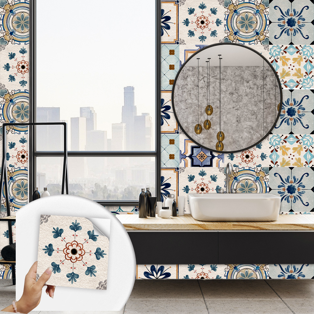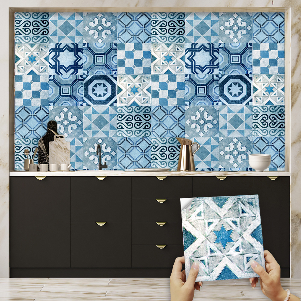 16枚/セットのレトロな青のシミュレーションタイルは台所のトイレを貼って自ら防水pvcの壁を貼って表面の明るい膜を貼ります。