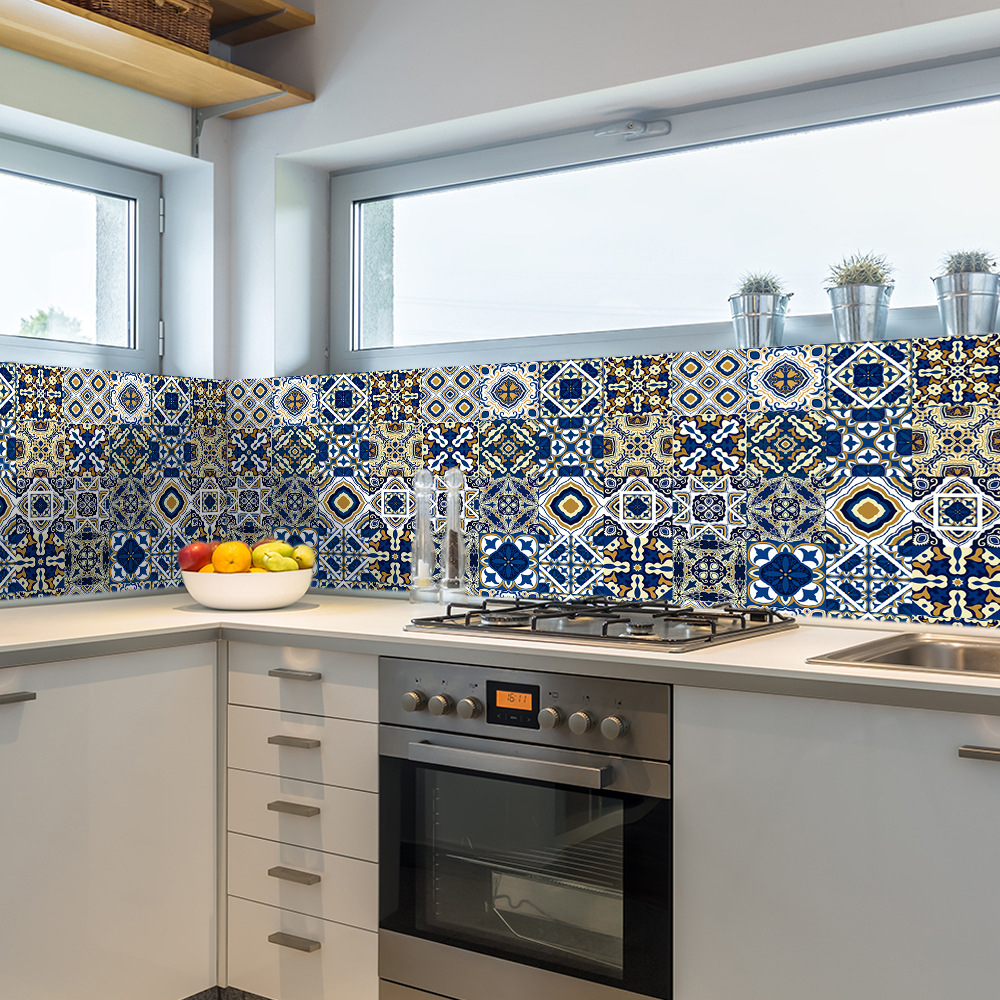 台所の防油シール花鳥模様のタイルはリビングのテーブルを貼って改装し、壁に貼り付けて表面の明るい膜を貼った