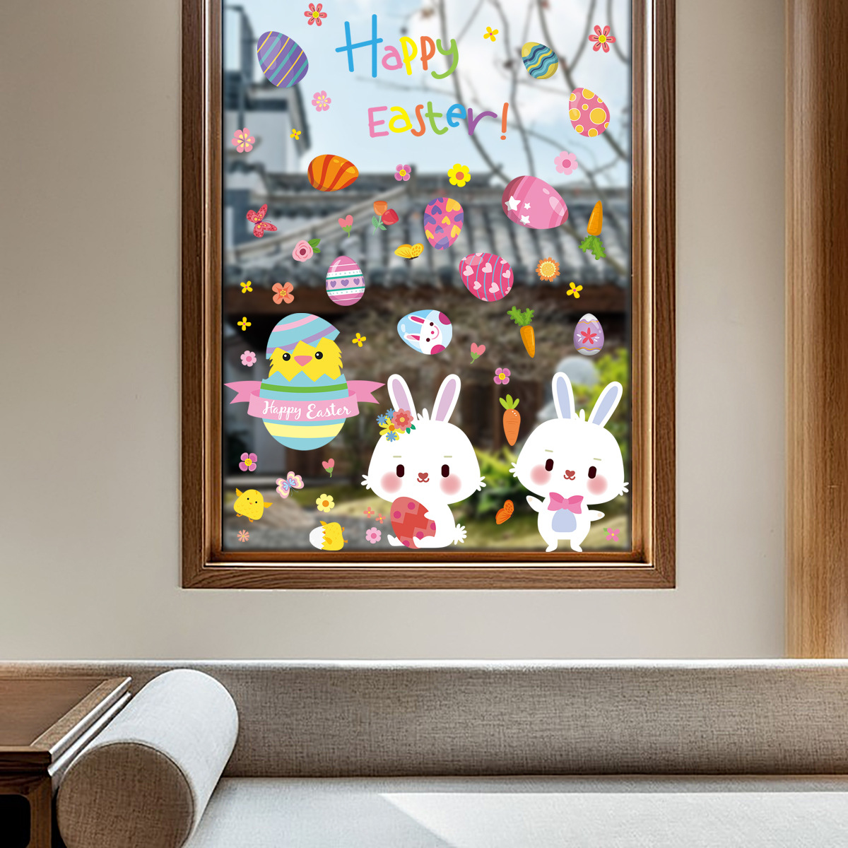イースターエッグウサギ両面印刷接着剤なしウォールステッカー静電ガラスフィルム店の窓の装飾用
