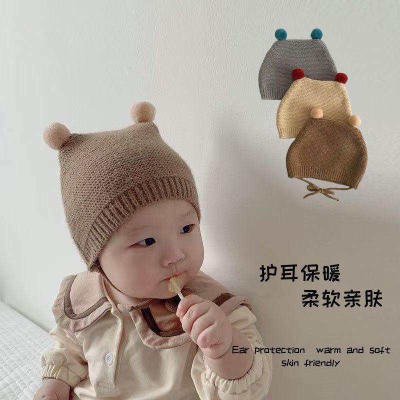 ベビー帽子秋と冬イン韓国スタイルファーボールニット耳保護帽子新生児レースアップ暖かい帽子