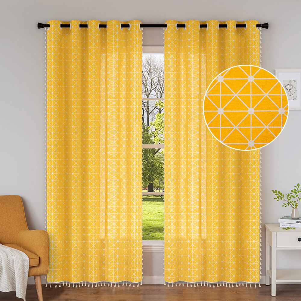 クロスボーダー古典的な格子カーテン遮光シンプルなリビングルーム寝室ダイニング完成品カーテン黄色幾何学タッセルカーテン