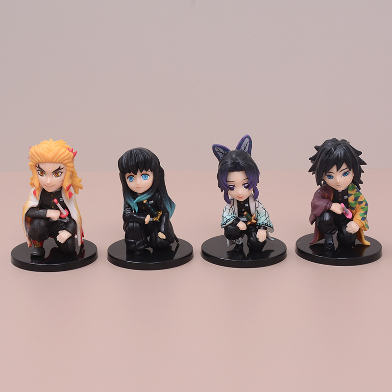 4種類の鬼滅の刃公仔私の妻善逸炭治郎富岡は蝶忍模型アニメの置物を遊んでいます。