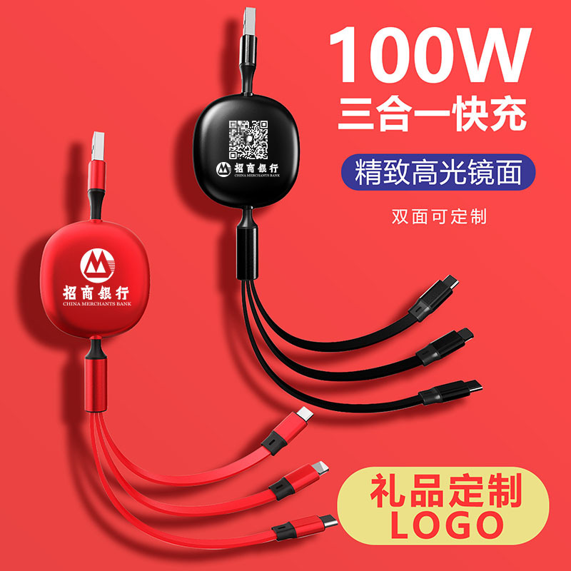 100W一引き三データ線企業プレゼント印刷ロゴ伸縮充電線三合一携帯電話データ線
