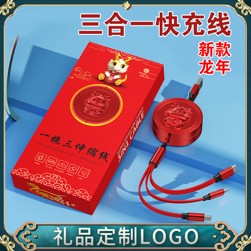 新年伸縮データケーブル一牽引三龍公仔プレゼント印刷広告ロゴ漫画三合一充電線