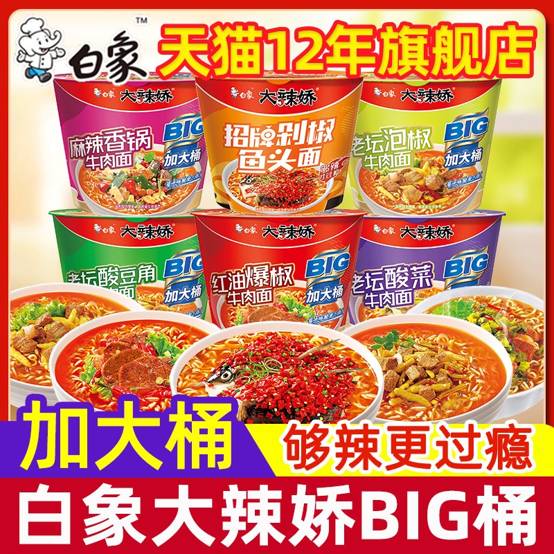 白象の大きい辛い泡の麺の箱の中の赤い油の爆発のピーマンの魚の頭の麻の辛い香の鍋のインスタントラーメンの大きい量の桶の詰め物