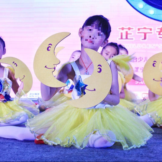 手に月の小道具を添えた子供たちの幼稚園のダンスパフォーマンス、月光のおとぎ話の庭の星のコーラスパフォーマンス