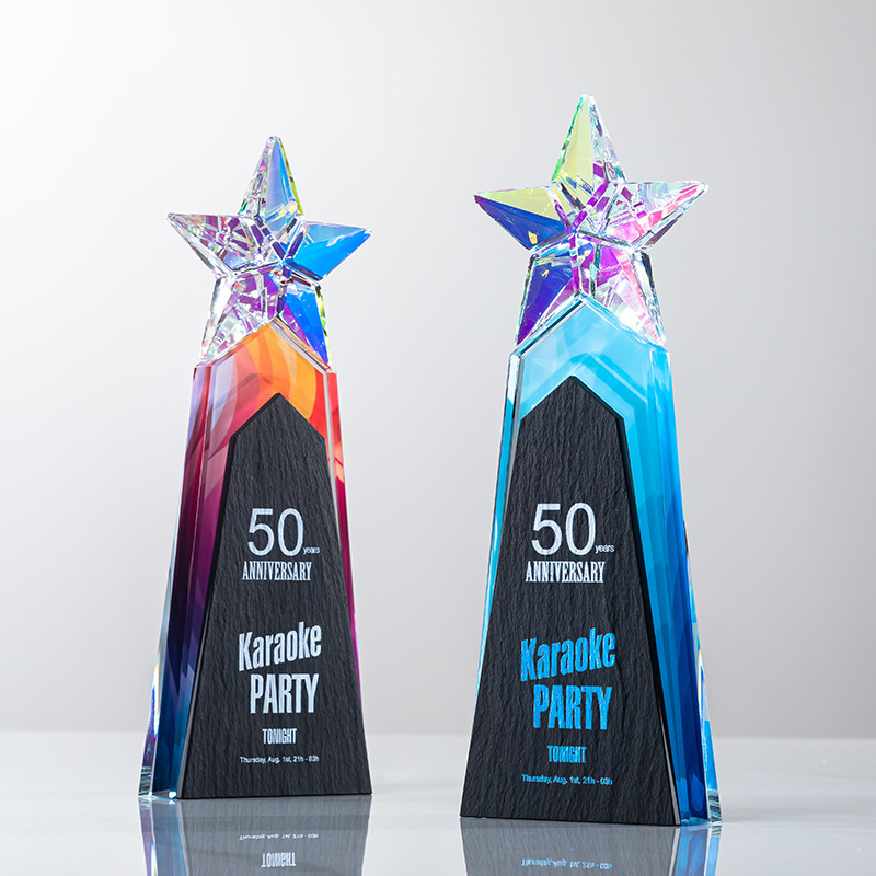カラフルな五芒星水晶トロフィーカラー高級ガラスメダル年次総会優秀社員授賞記念品彫刻