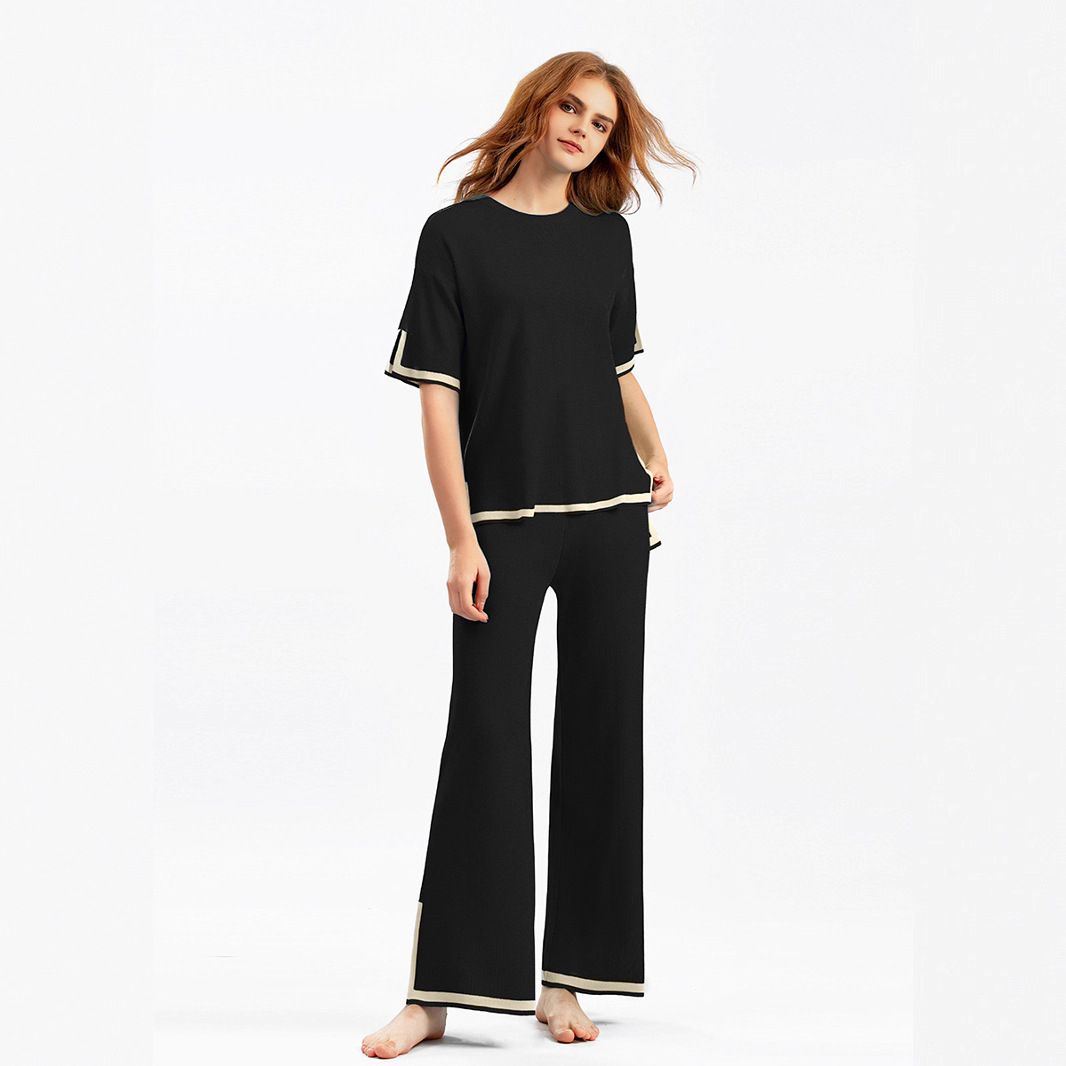 新しいファッションスーツ、コントラストカラーのスリット半袖セーター+ハイウエストスリムワイドレッグパンツ2点セット