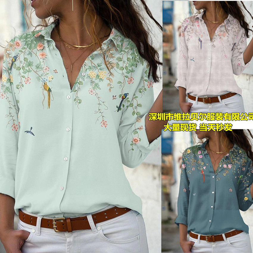 スポットヨーロッパとアメリカの貿易アマゾンレディースルーズラペル長袖シングルブレストシャツ気質レディプリントトップ