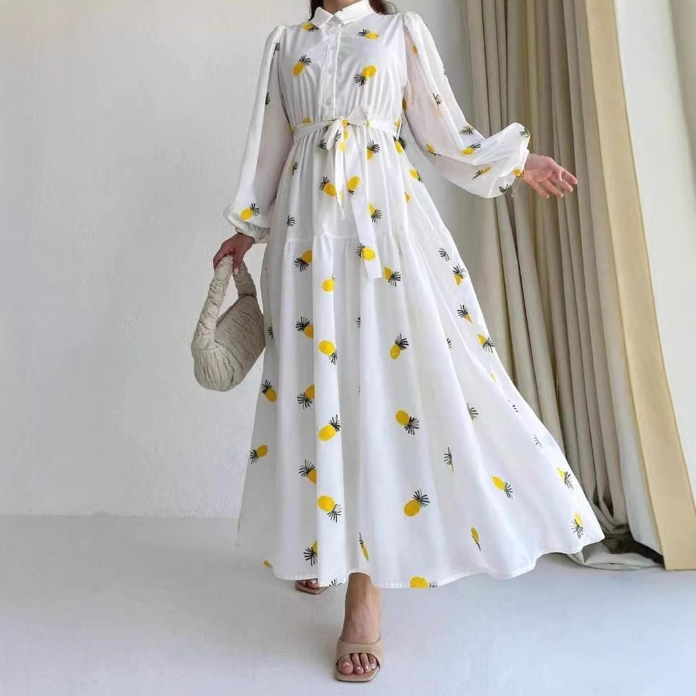 LF9809009 フルーツプリント長袖ウエスト中東ドレス