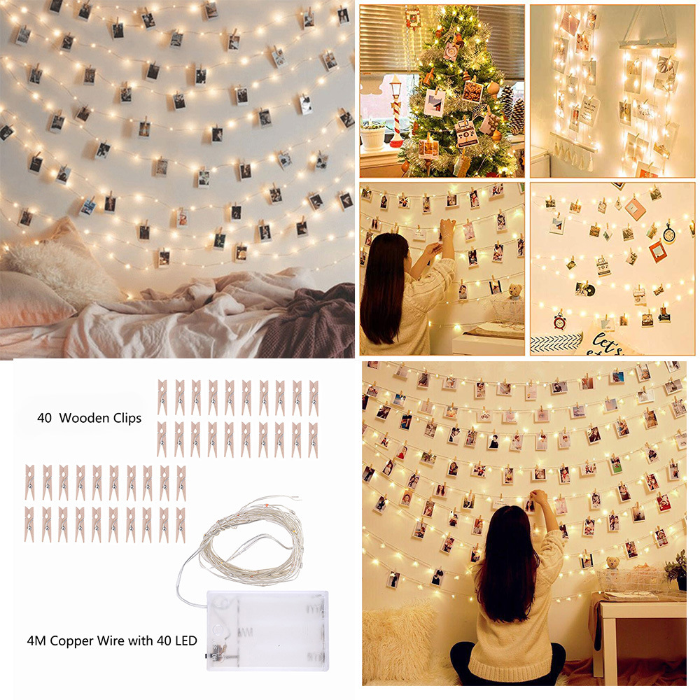 新しい木質は2メートルの木の銅線の写真クリップランプを取り外してクリスマスの満天の星の装飾ランプを並べます。