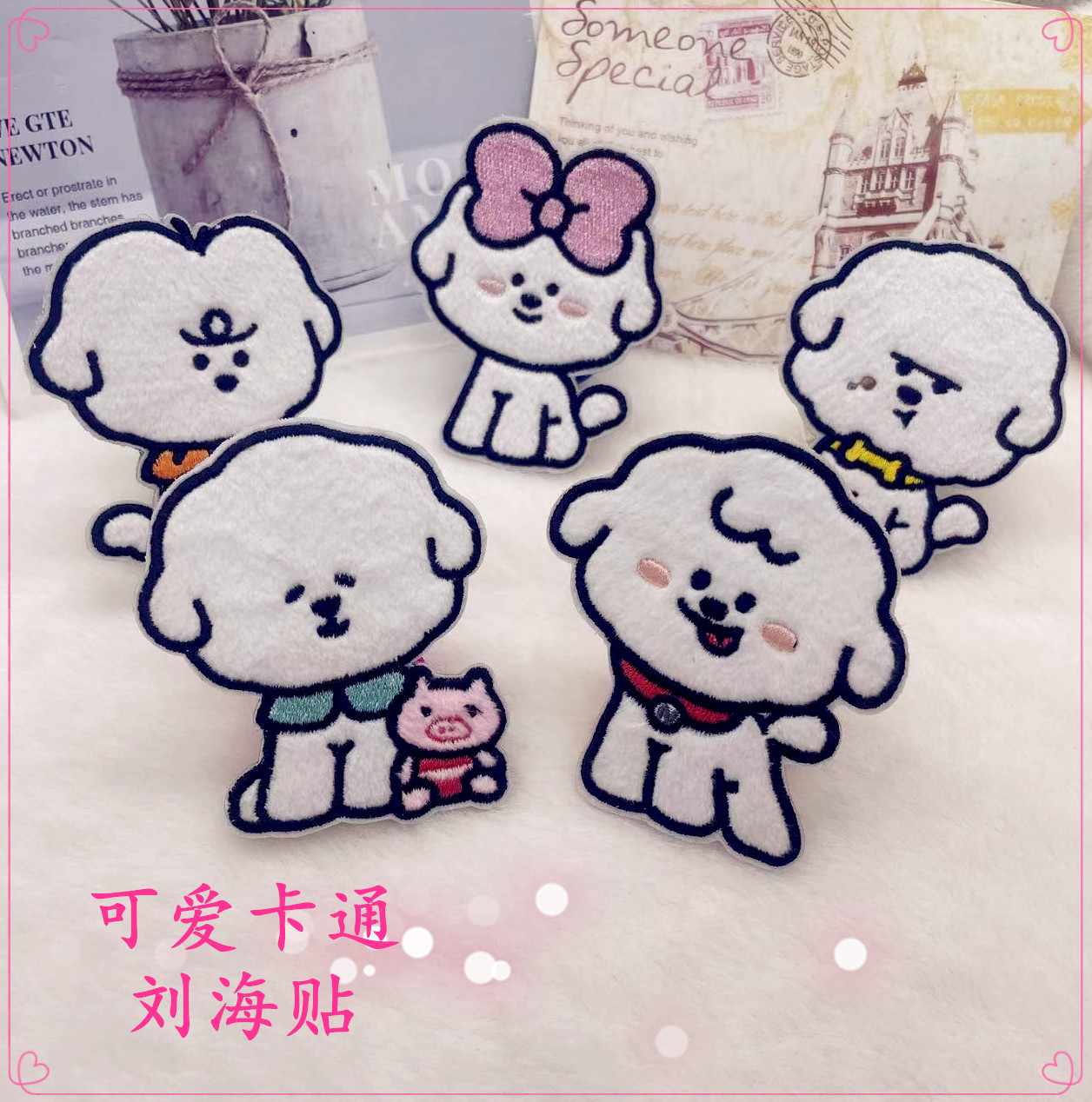 ナナのようなかわいいぬいぐるみの子犬の前髪は痕跡のないマジックを貼って髪を飾って女性の髪をくっつけて神器を整理します。