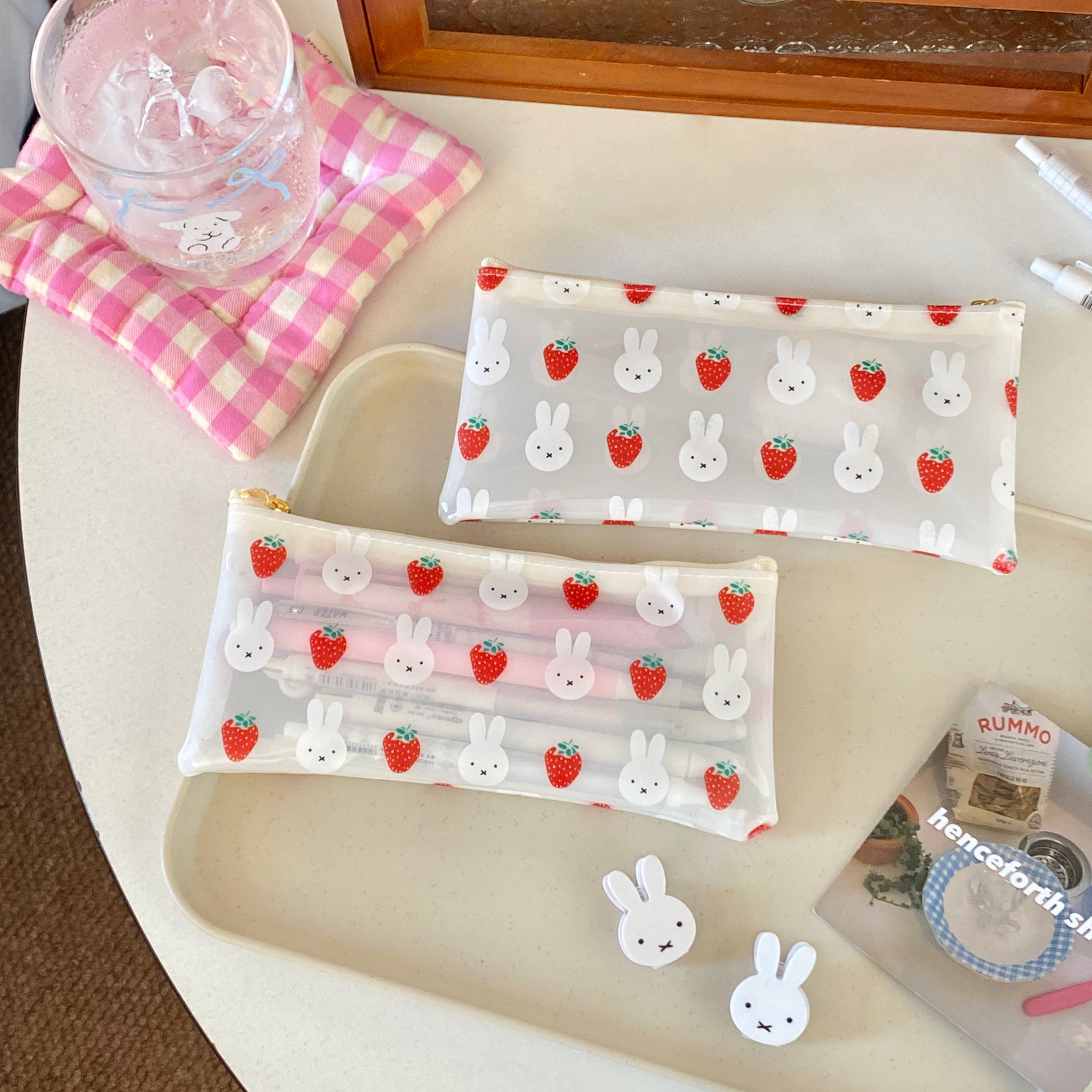 見栄えの良い透明鉛筆バッグかわいい漫画の女性イチゴウサギ収納袋 PVC 学生ゼリーバッグ文具バッグ