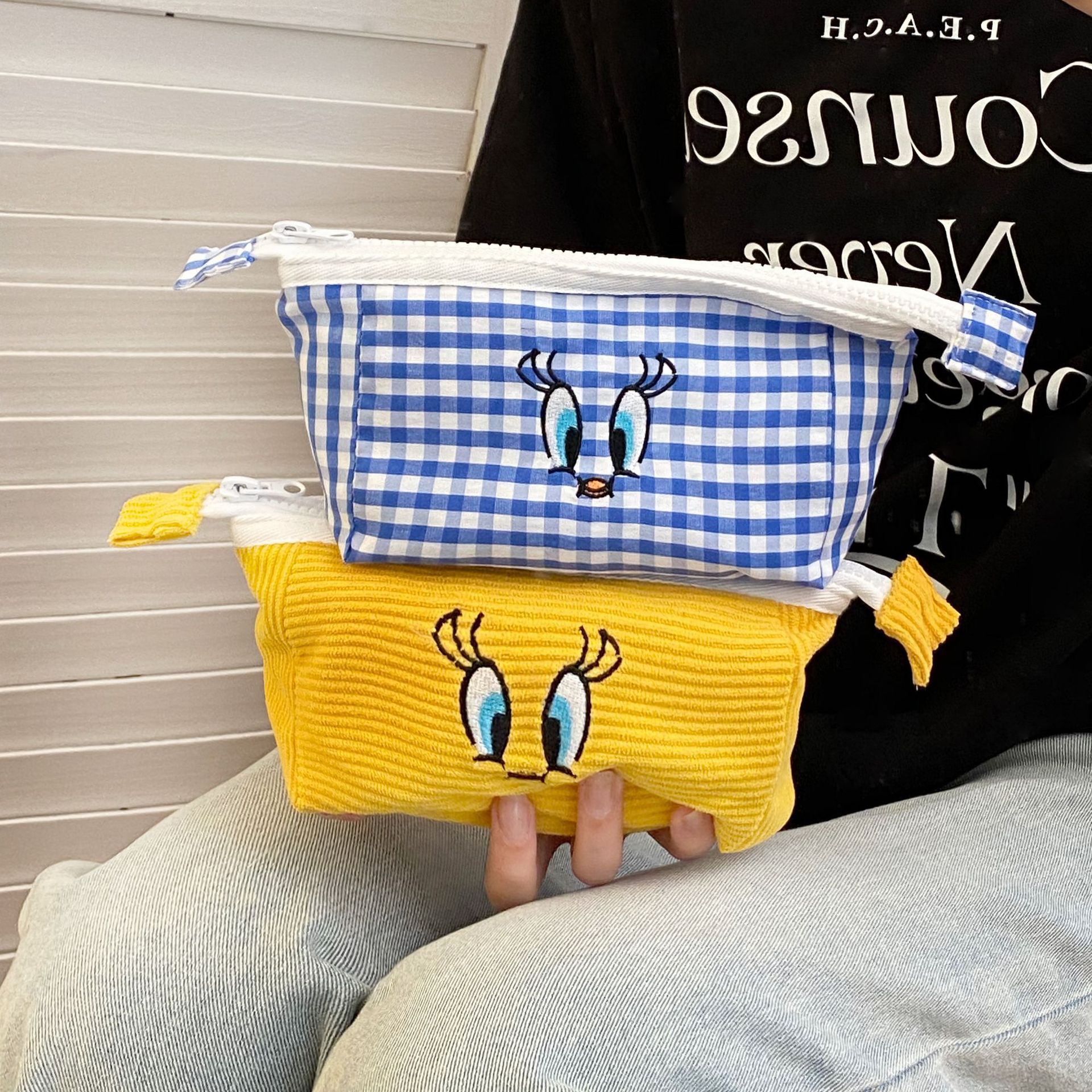 かわいいカワセミ鉛筆バッグ韓国語版刺繍チェック柄文具バッグ学生漫画文具箱大容量ポータブル収納袋