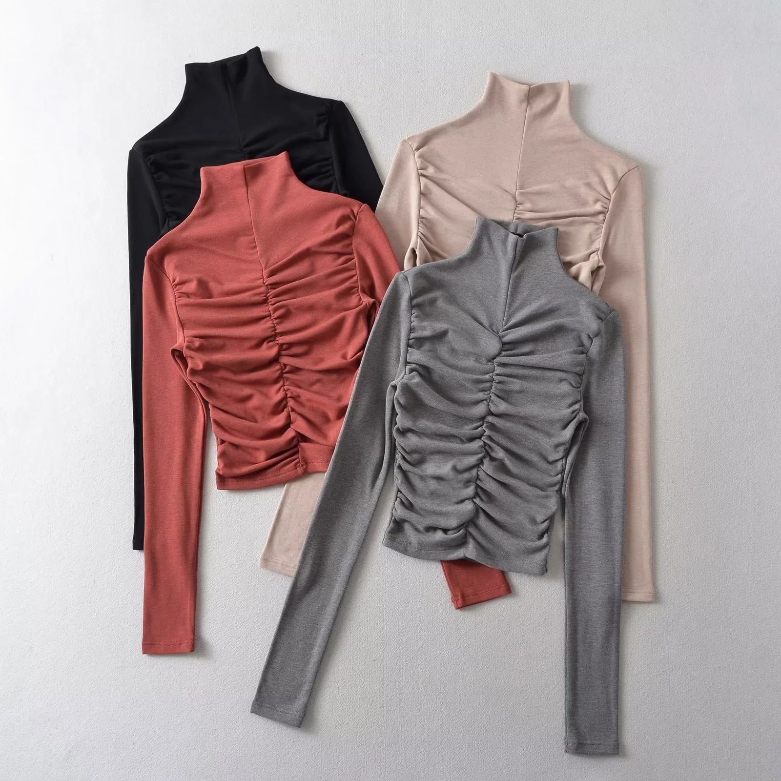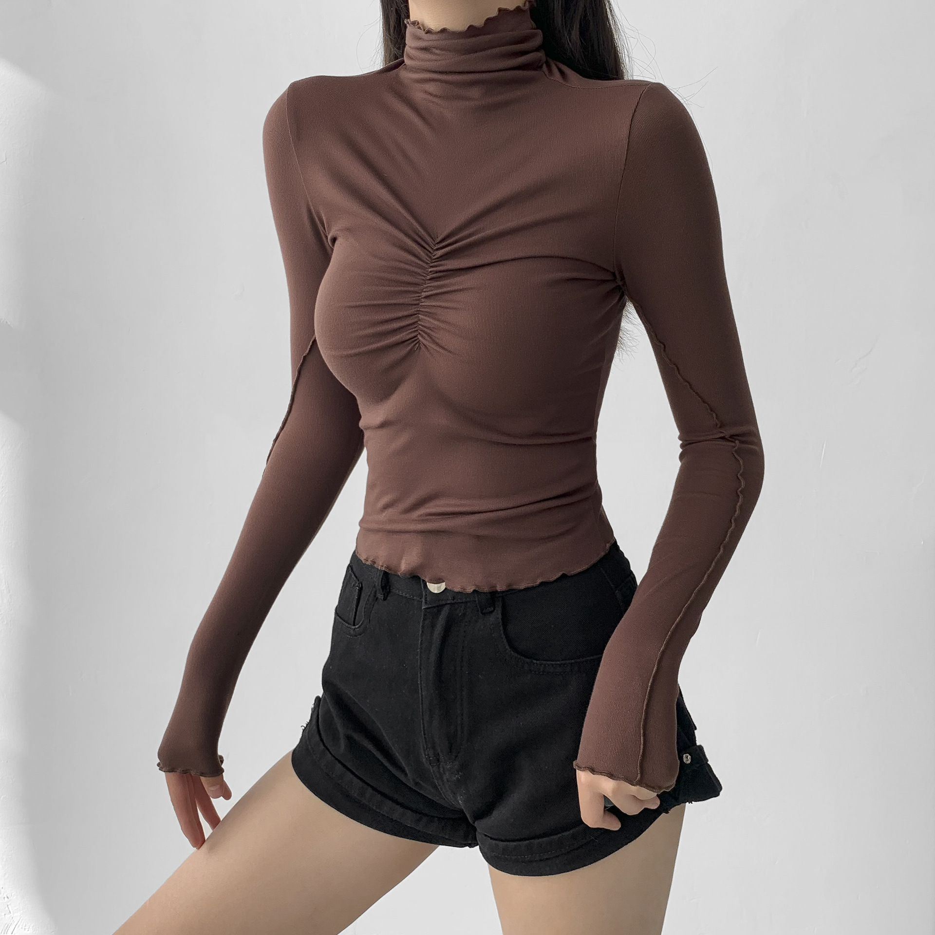 ギャル風のしわの長袖の底のシャツの女性の2023秋冬の新型の欧米のinsの身の小さい高襟はやせているtシャツを現します。
