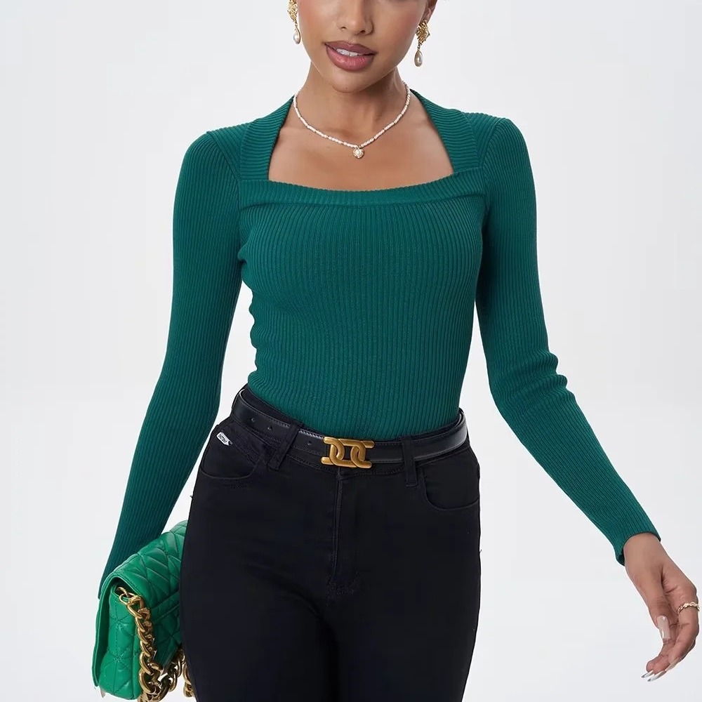 アメリカ式2023秋冬モデルの純色の四角形の襟元のニットの女性のギャルの弾力は身を修めて底のニットの上着の潮を打ちます。