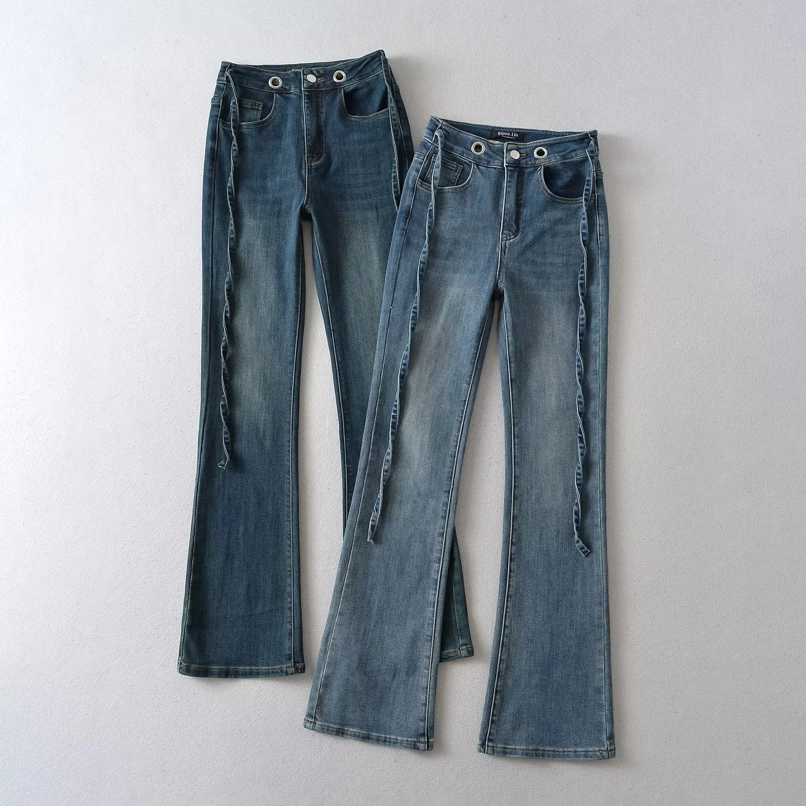 2023秋冬レトロな高腰の帯の小さいラッパのジーパンの女性の水洗いの弾力は身を修めて少し辛いです。