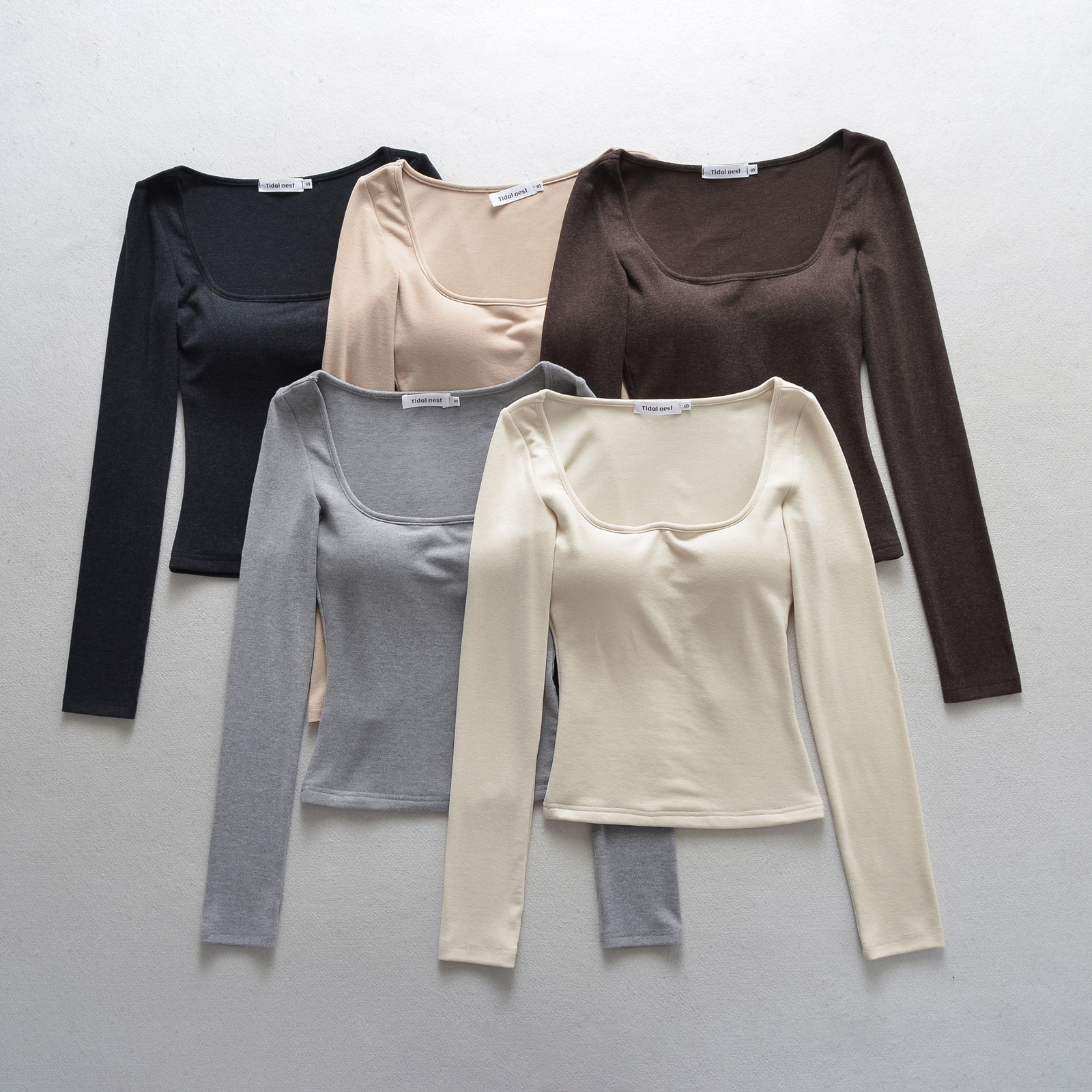 胸パッド付き一体保温磨毛長袖上着女2023秋冬新作純欲方襟修身tシャツ