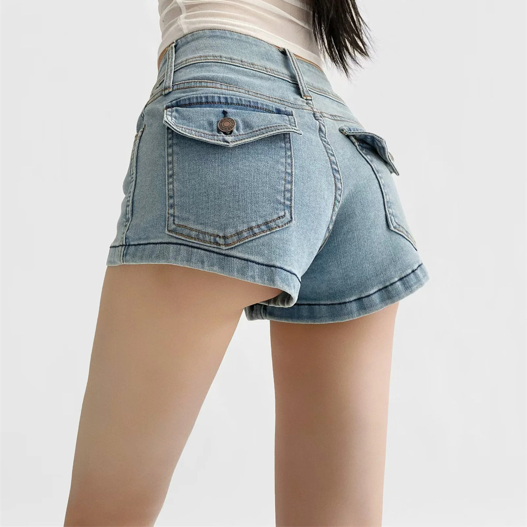 ヨーロッパとアメリカンスタイルのレトロなニッチホットガールミッドウエストタイトでセクシーなヒップカバーホットパンツ女性の夏のマルチポケットデニムショートパンツ