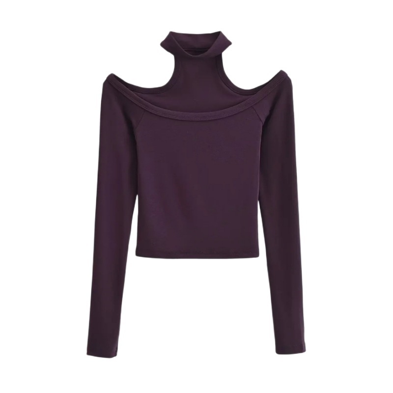 ヨーロッパとアメリカのインブロガー風ワンラインカラーセクシーホルターネックオフショルダー長袖Tシャツ女性用ホットガールアウタースリムフィットボトムストップ