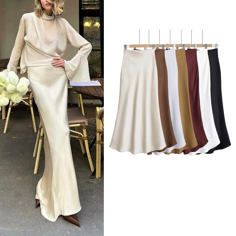 ZA春の新型女性欧米ファッション百合シルクサテンの質感超長超仙気質高腰迷笛半身スカート