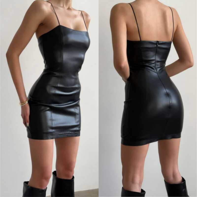 風情万種のおしゃれで純粋な風のギャルの黒色のpu皮は尻を包んで身を修めてやせているスカートのガーターのワンピースを現します。