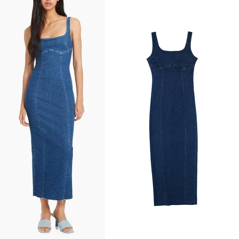 Za秋の新型気質は腰を収めてやせています。レトロな一字襟のヒップスカートのストラップデニムのロングワンピースです。