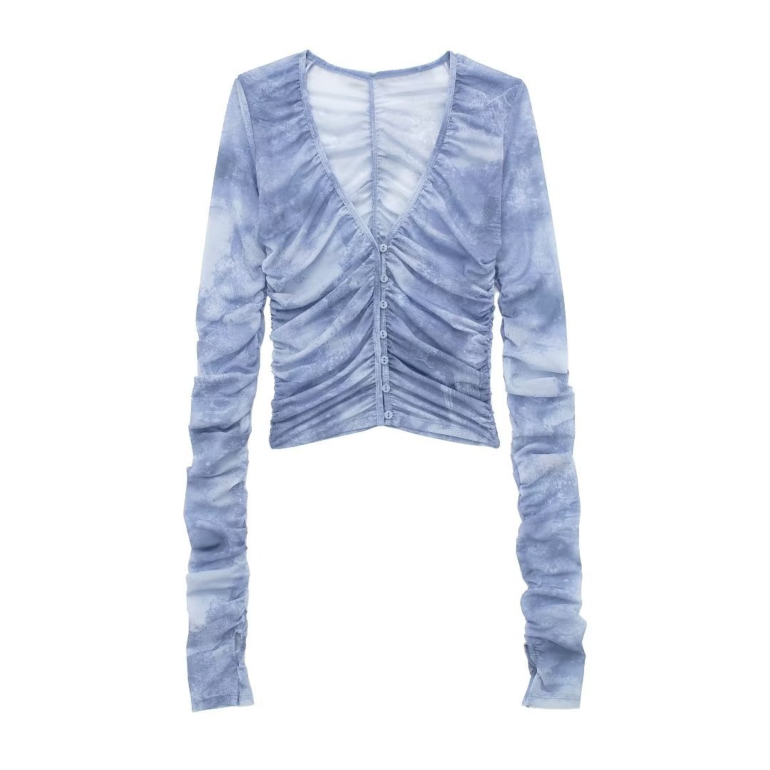 欧米のギャルの絹のネットのプリントのしわの長袖のtシャツの女性の2023秋のセクシーな深いv襟の微透のボタンの上着の女性