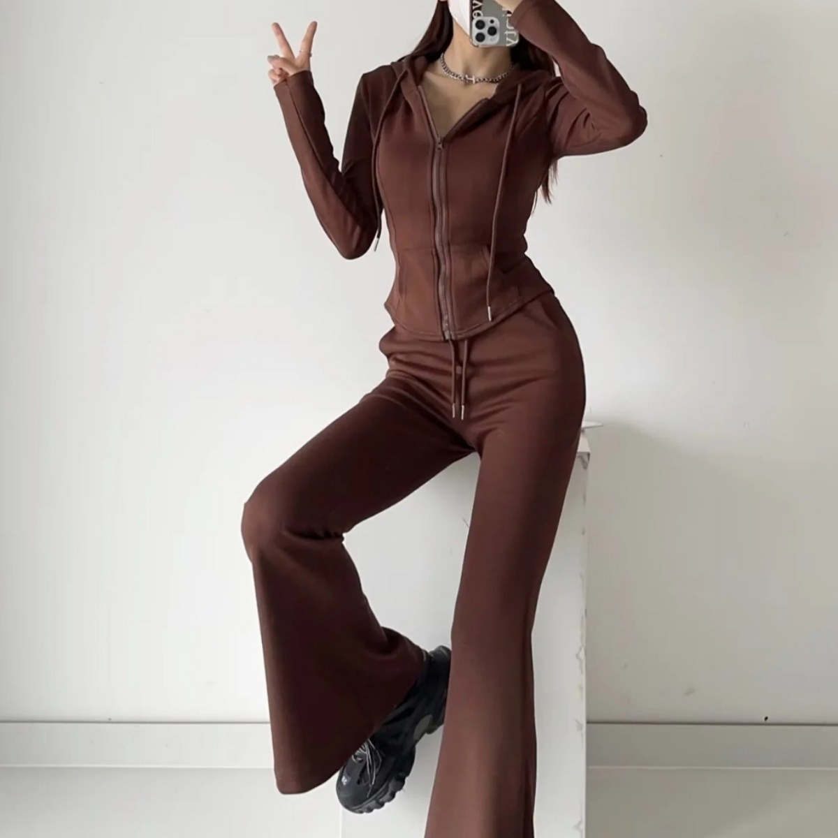 2023秋にウエストを締めてカーディガンと帽子付きのパーカーのコートを掛けます。