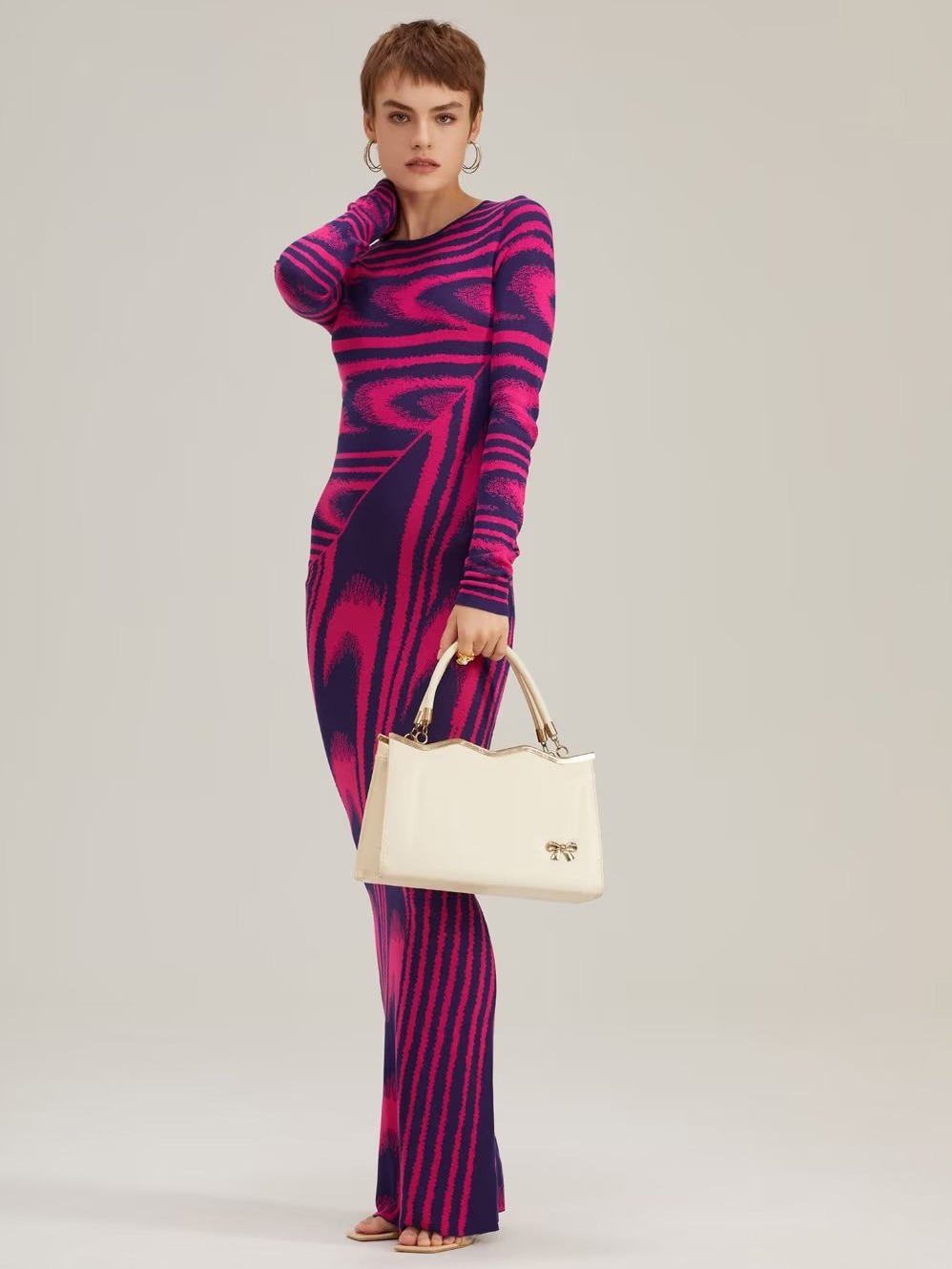 2023秋の新型丸首長袖抽象模様メリヤス弾力ワンピースロングスカート卸売り