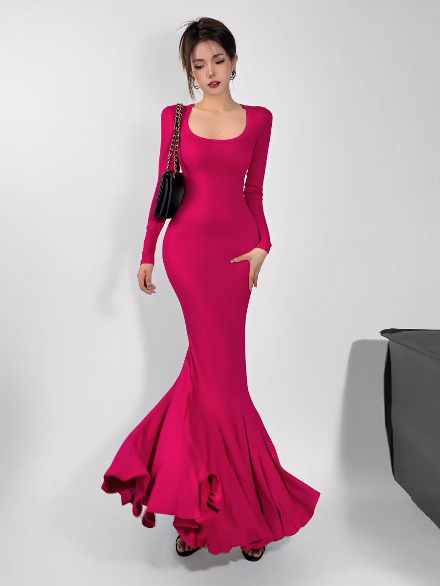 2023秋の新型甘辛いU字襟長袖修身高腰が痩せている蓮の魚の尾のワンピースのロングスカート