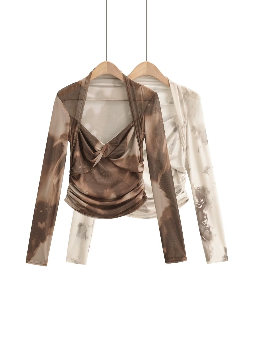 2023秋の新型網紗プリントのタック長袖の方襟の修身の短い女性のtシャツの上着の卸売り
