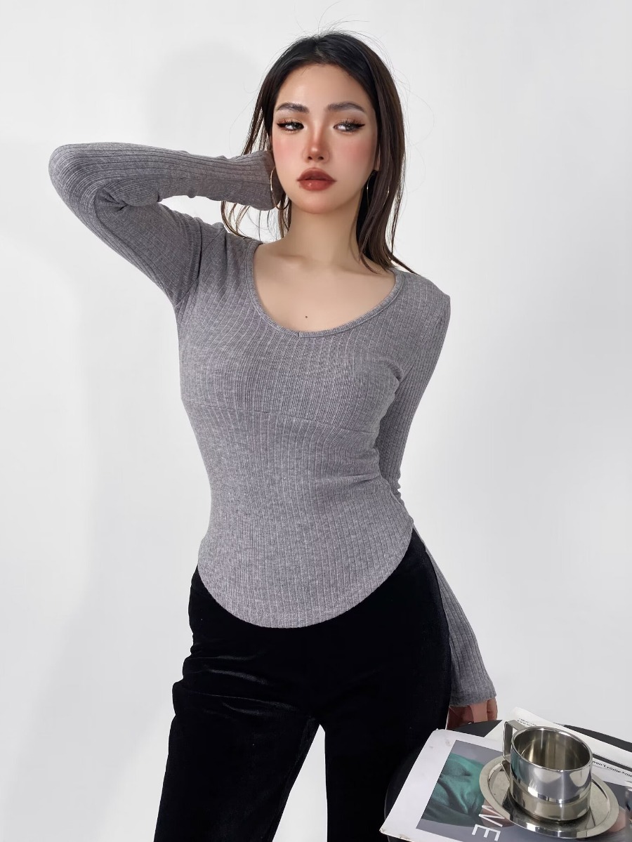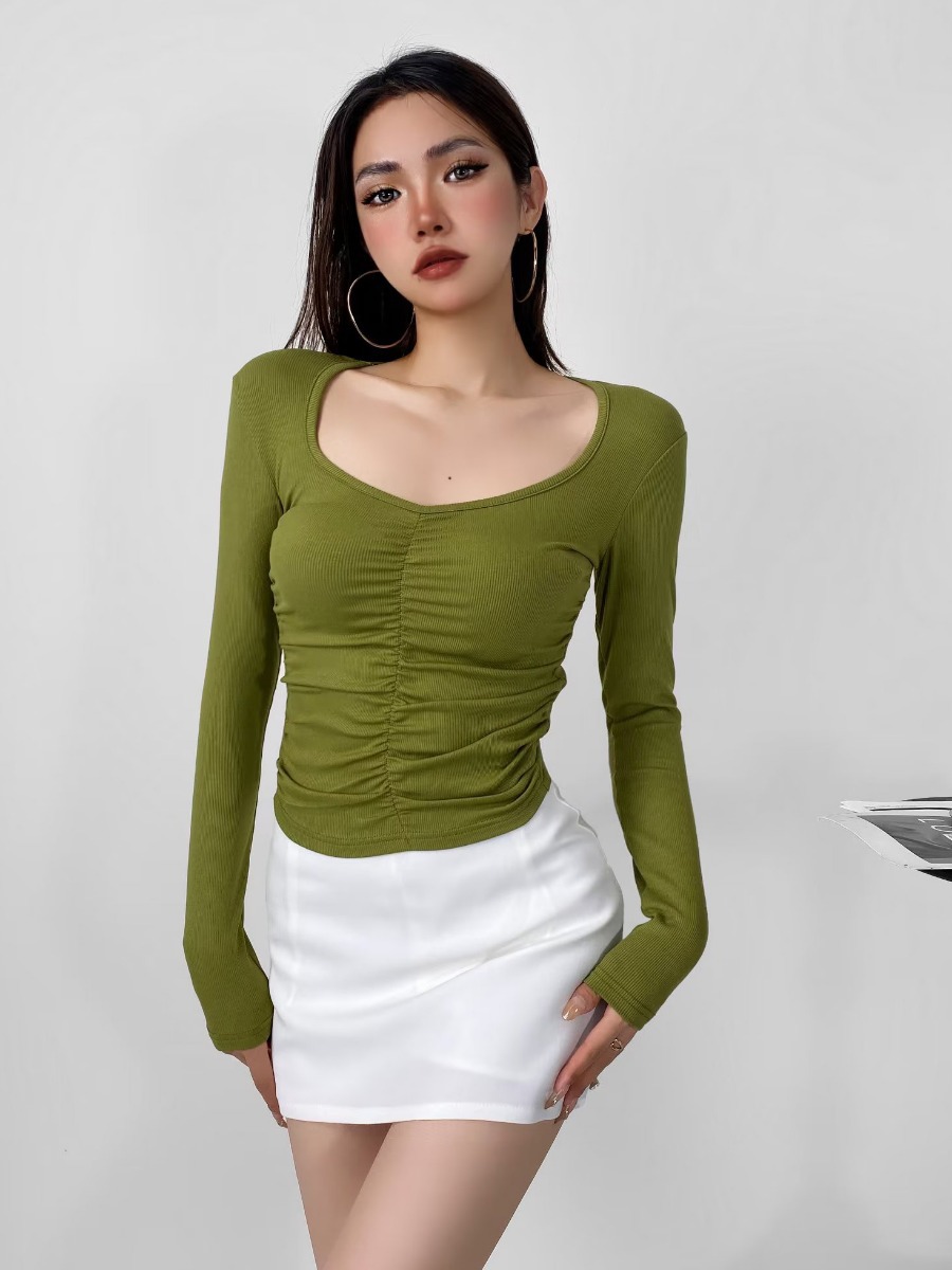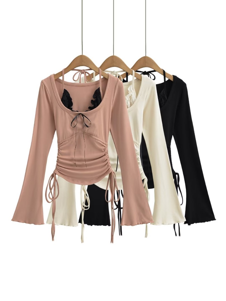 2023秋の新型の小衆のしわの設計欧米の純粋な欲のギャルは身を修めてやせている長袖のtシャツの上着を現します。