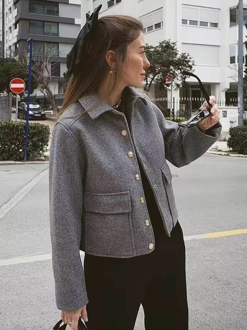 2023春の新しい大きなポケットの金属ボタンの短い襟の長袖の上着の卸売り