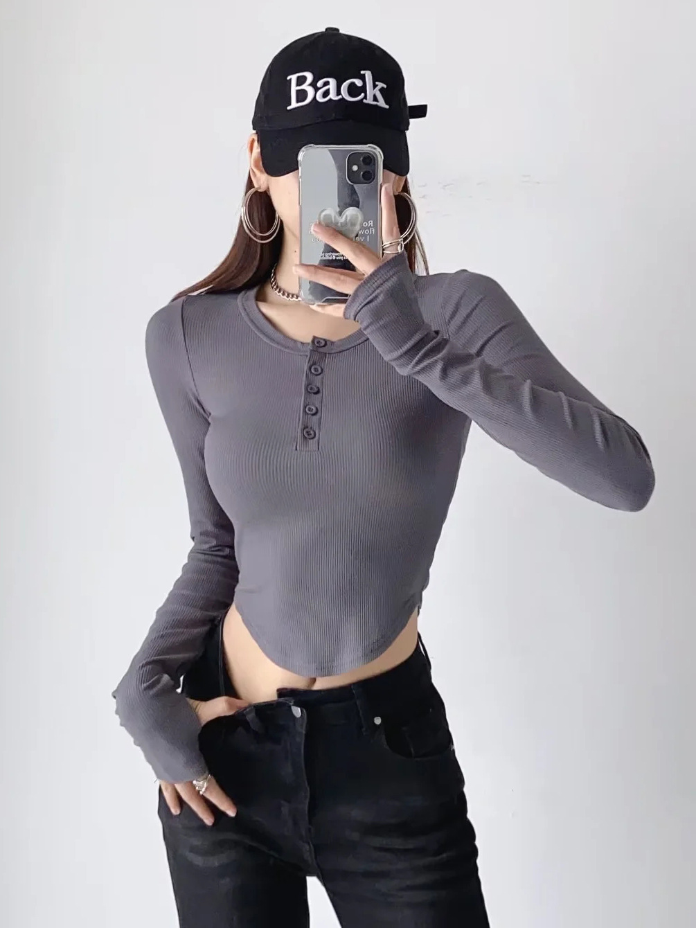 2023秋の新型ギャル婦人服の長袖のボタンのアーチ型の裾の丸首の修身の短い金の露指の女性のtシャツ