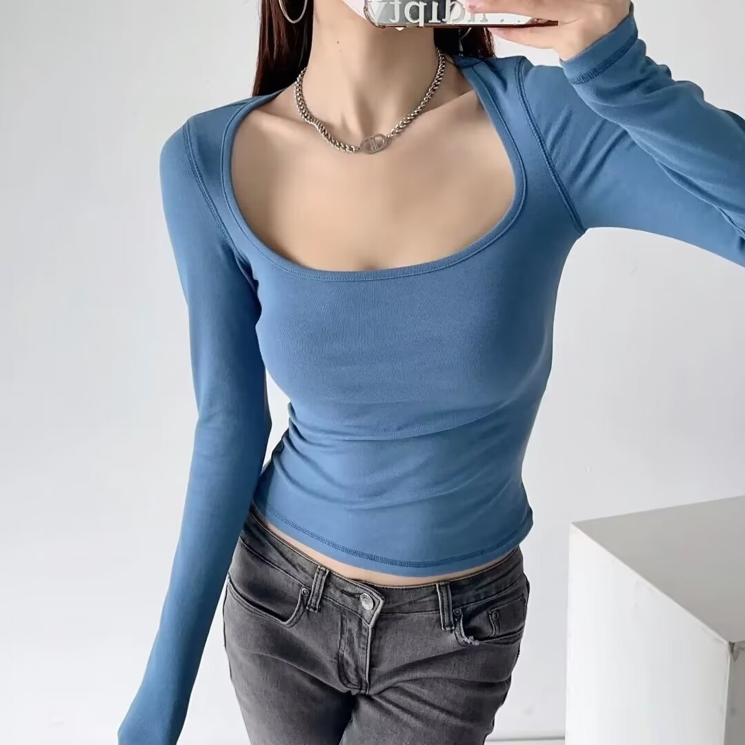 欧米風2023秋冬新作五色修身大方襟長袖tシャツ修身純色上着I10-A190