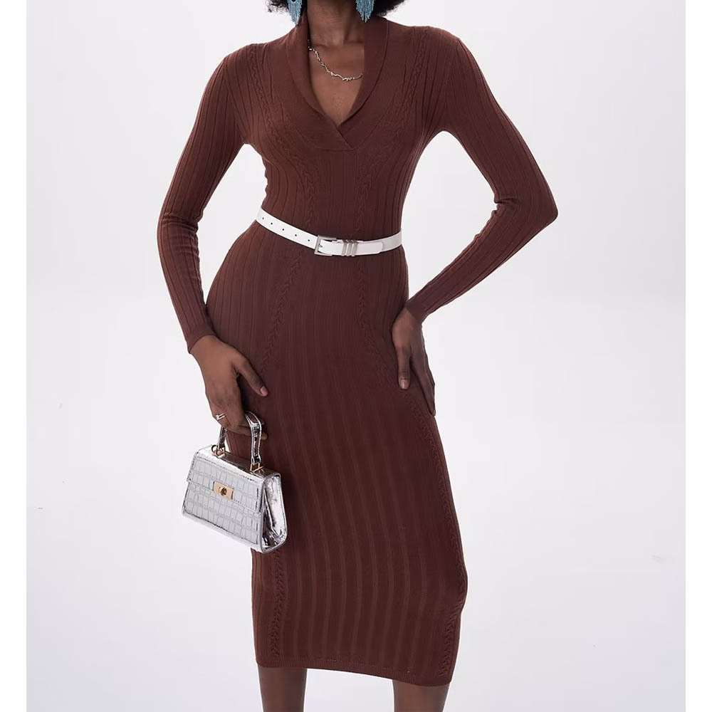 欧米風2023冬の新型四色襟折り花ニットロングスカートvネック純色ワンピースT10-A280