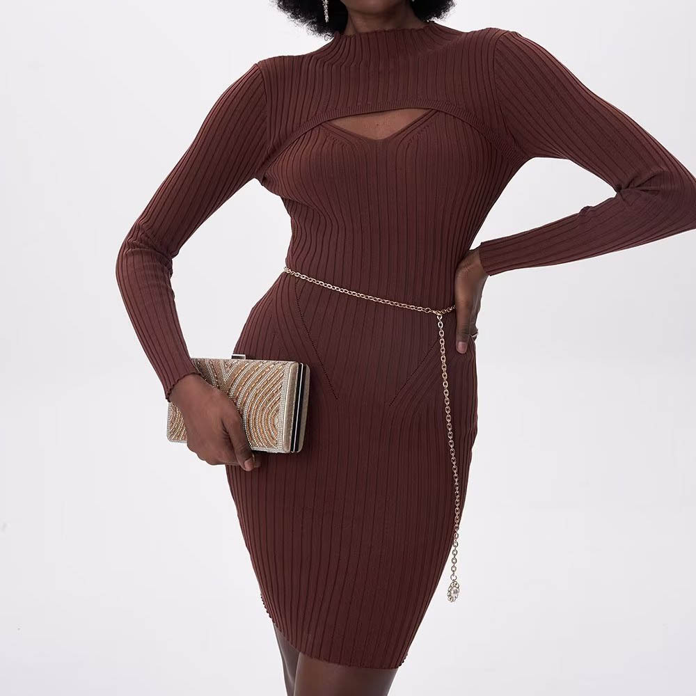 欧米の2023冬の新型の5色の丸首のカバーはフォークのニットのワンピースのセクシーな中で長いスカートのT10-A276を指します。