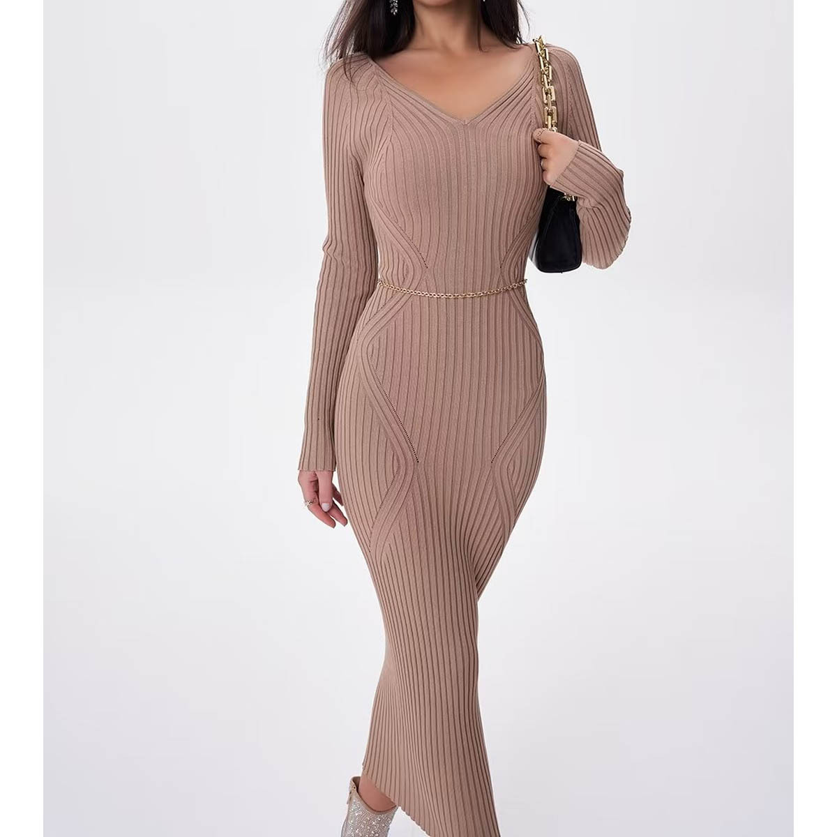 欧米風2023冬新作四色vネック立体花柄ニットロングスカート純色ワンピースT10-A279